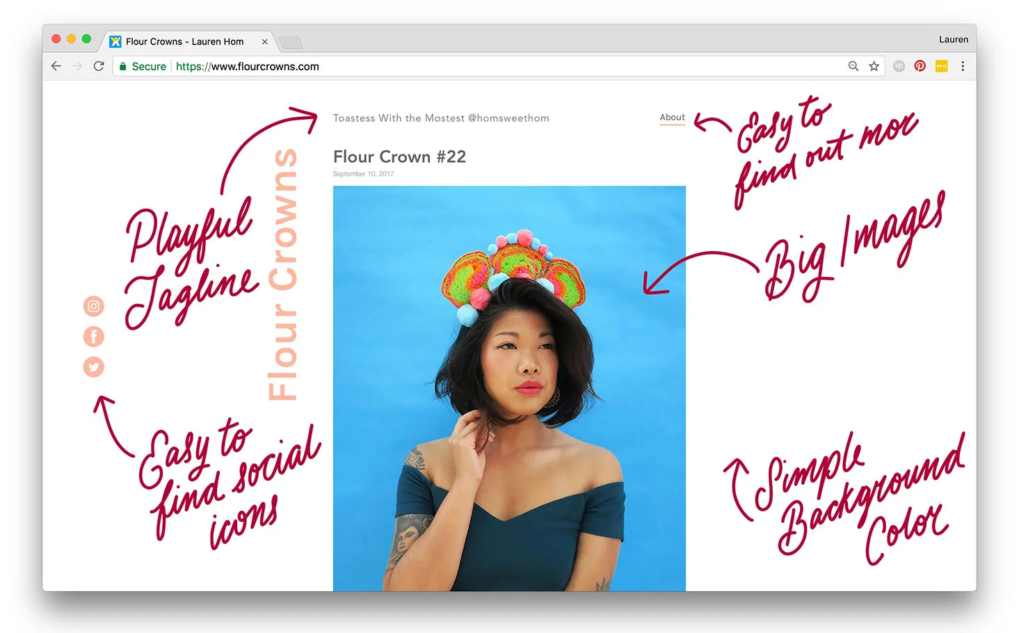 I always make sure to include a sentence or two on the homepage that gives a brief description of the project. This helps viewers to quickly understand what your website is all about. Since we live in age of constant jumping around on the internet and social media, our attention spans are shorter than ever. A short and clever tagline is a great way to help capture someone’s attention, and it shows off a little bit of your personality right off the bat. I went with ‘Toastess with the mostess” for Flour Crowns (and my social media handle) to complement the fun images.