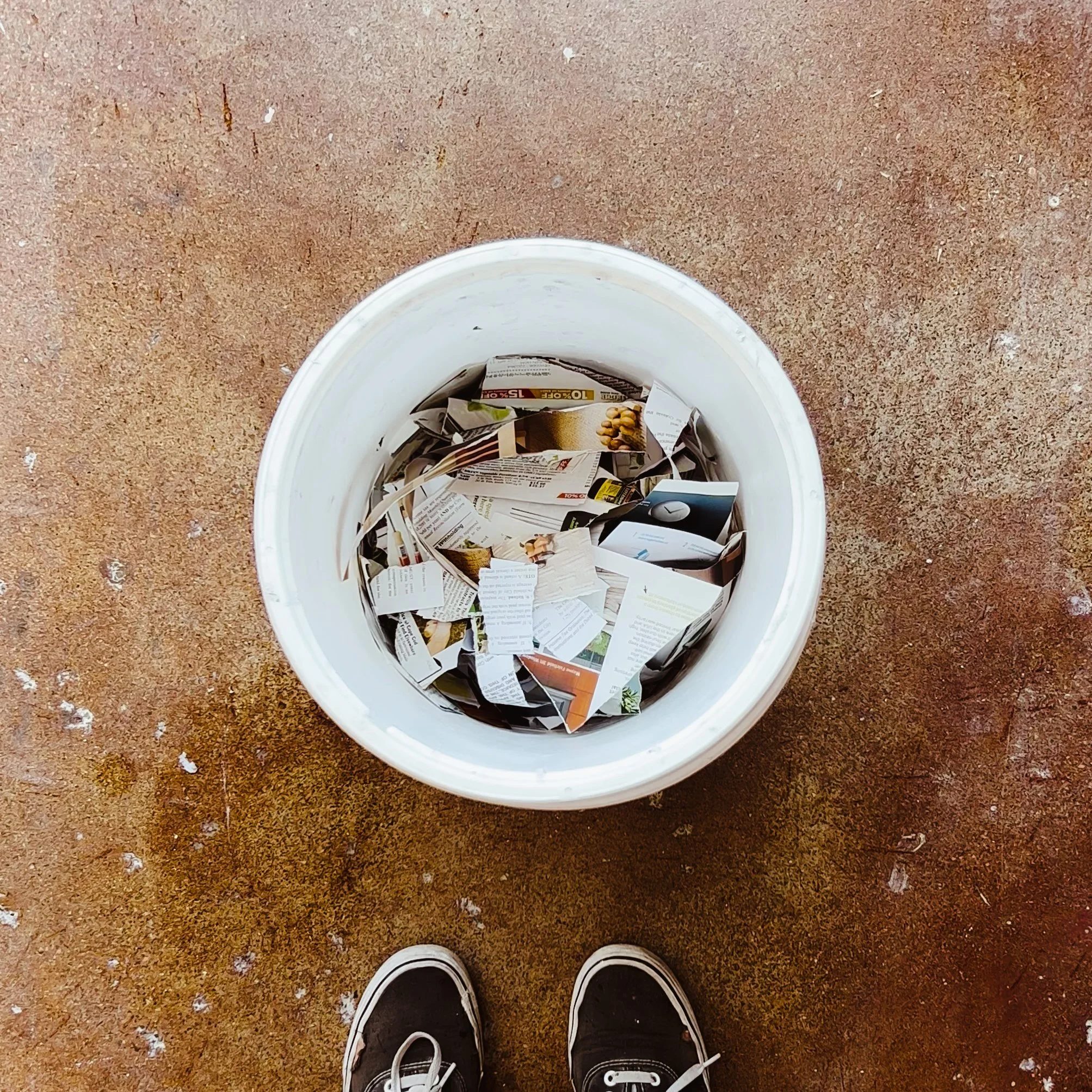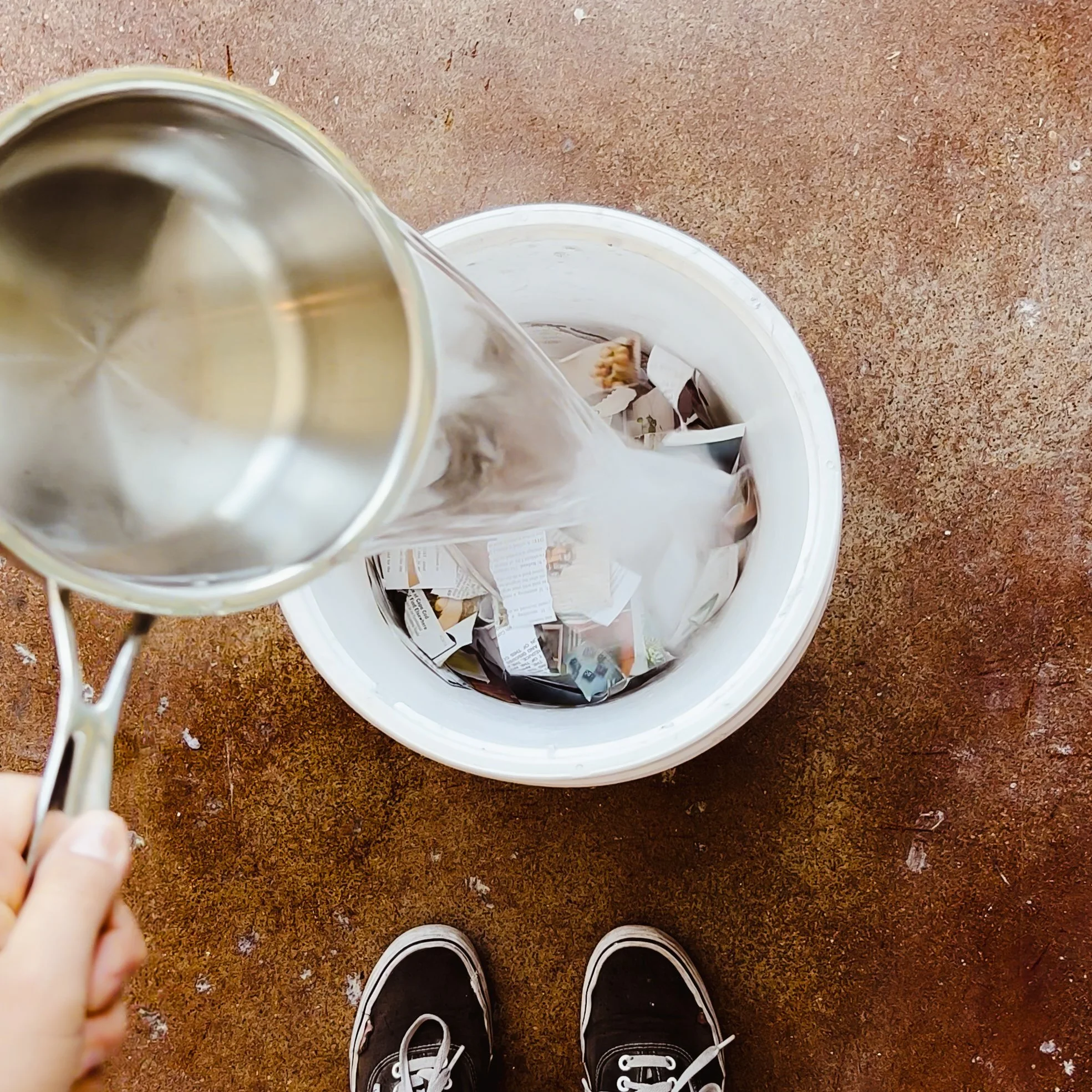 Fill 1/4th of the bucket with loosely shredded mail (exclude plastic windows and staples). I shred mine by hand, but if you have a paper shredded, that’ll be easier.